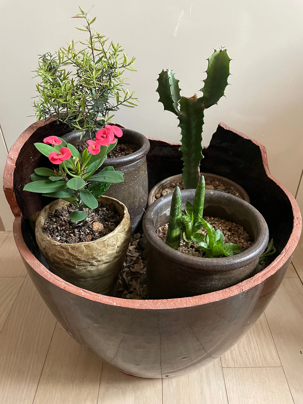 고민하다 깨진 단지에 모래와 작은 자갈을 채우고 그 안에 작은 화분들을 넣었다. 마치 엄마 닭이 병아리를 품고 있는 듯 보기가 나쁘지 않다. 됐다. 깨진 단지는 그렇게 버려지지 않고 살아남았다. 안에 넣는 화분들을 바꾸어 가며 조금씩 변화 주는 재미도 있다.