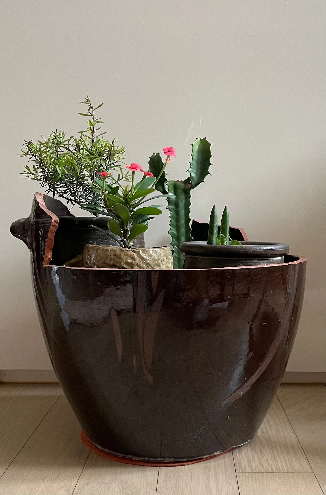 그런데 장독 깨진 부분이 칼로 자른 듯 깔끔하고 손잡이 한쪽이 붙어 있는 모양도 신기했다. 화분으로 쓰면 예쁠 것 같아 흙을 채우고 식물을 심었는데 그 단지가 간장 단지였었던지 계속 짠물이 배어 나와 어떤 식물도 살지 못했다.