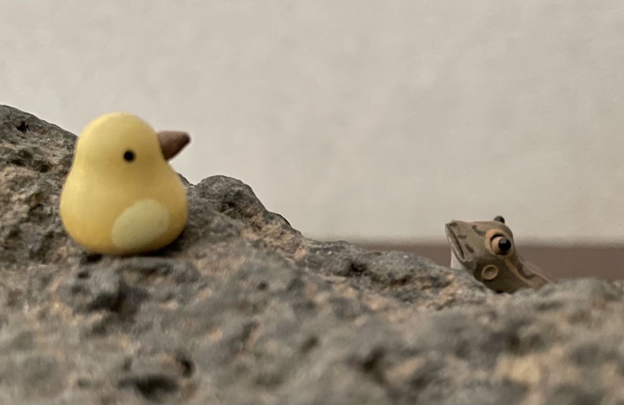 넌 누구니? 삐약. "난 청개구리. 개굴."