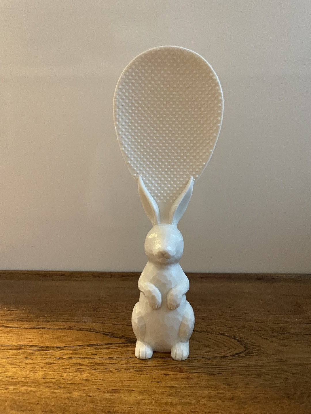 하얀 토끼가 귀엽게 두 손을 앞으로 하고 서있다. 몸통은 손잡이이고 귀와 머리 위쪽이 둥그런 주걱이다. 도톨도톨해서 밥알이 안 붙는 주걱이라는데 밥알이 조금 덜 붙을 뿐 붙기는 붙는다. 무엇보다 밥 솥 옆에 세워 둘 수 있어 편리하고 깔끔하다. 쓰고 있던 플라스틱 주걱과 대나무 주걱은 서랍으로 들어가 친구들과 껴 누웠고 이 토끼 주걱이 그 자리를 차지했다. 모양도 예쁘고 기능도 훌륭해서 자기 존재감이 확실했다.