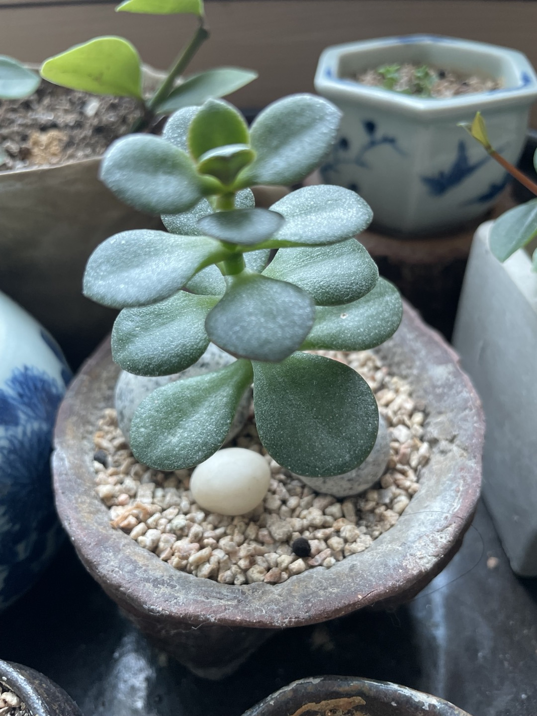 종지 화분들 사이에 아기 손가락 만한 다육이가 반듯한 잎을 펼치고 있다. 맞다 그 다육이다. 화분을 옮길 때 작은 가지 하나가 떨어져서 별 생각 없이 집으로 가져와 심었는데 그 후 10년 동안 여러 번 죽을 고비를 넘기며 살아내고 있다. 엄마가 떨구어 낸 가지 하나가 아직도 생명을 이어 가고 있다. 이것도 참으로 신기하다.