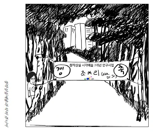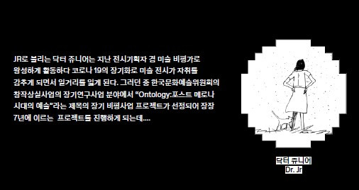 지원을 포기한 이유는 사업에 대해 책임감과 진정성을 가지고 임해야 한다는 전제에 진심으로 동의하게 되었기 때문이다. ‘대충대충’에 대한 유혹과 자기 황폐화는 한 쌍으로 존재하기 때문에, 어떤 사업에 장기간 타인들과 결속된다는 것은 겁나는 일이기도 했다. 조금 더 깊이 있는 경험을 했다면, 지금과는 또 다른 평가를 내릴 수 있을까. 사업의 증표로써 남아 있는 것은 거실 책장에 꽂혀 있는 책 한 권, 책 속에 담긴 그림과 글을 창작하며 생각하곤 했던 예술의 미래와 기획자 삶의 비전에 대한 부정적 진단들이다. 작가들과 함께 펴냈던 웹툰을 위해 직접 쓰고 그렸던 에피소드는 작품의 물질성과 예술노동이 거의 소멸된 가까운 미래에도 예술 복지를 꿈꾸는 예술인들에 대한 냉소적인 묘사와 그들을 상대로 AI 기반의 대리 지원서를 써준 대가로 거부(巨富)가 되어, 드디어 기획의 족쇄에서 벗어난 JR(쥬니어, 웹툰 캐릭터)의 자전적 미래상이 담겨 있다.
