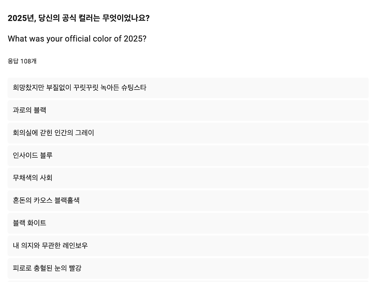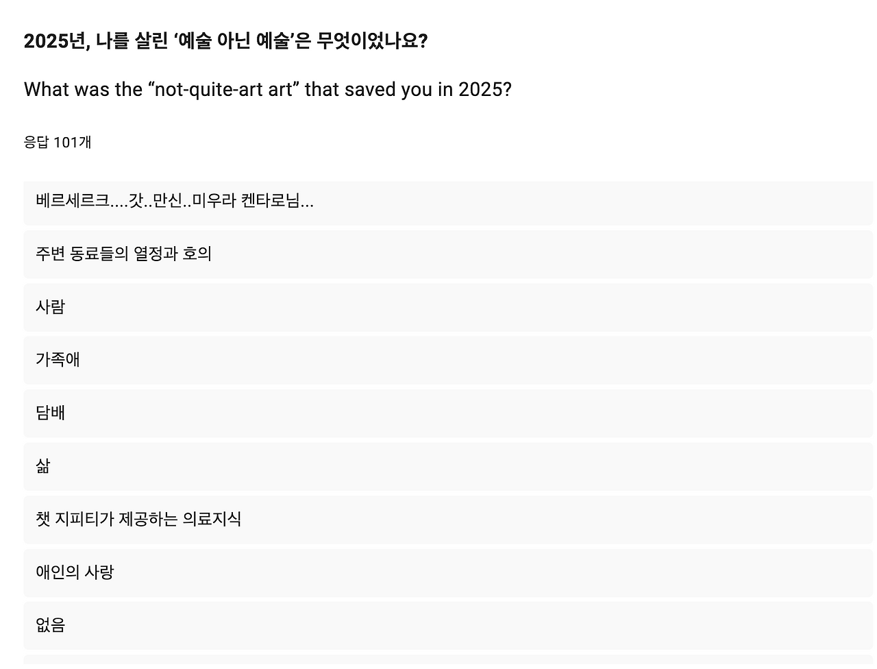 2025년 연말에 수집된 답변들을 2월에서야 다시 꺼내봅니다. 약 사흘 동안 총 115명 이상의 미술계 동료들이 대가 없이 설문에 참여해 주셨고, 그 결과를 지난 12월 12일 저녁, 연남동 모처의 연말 모임에서 공유한 바 있습니다.
