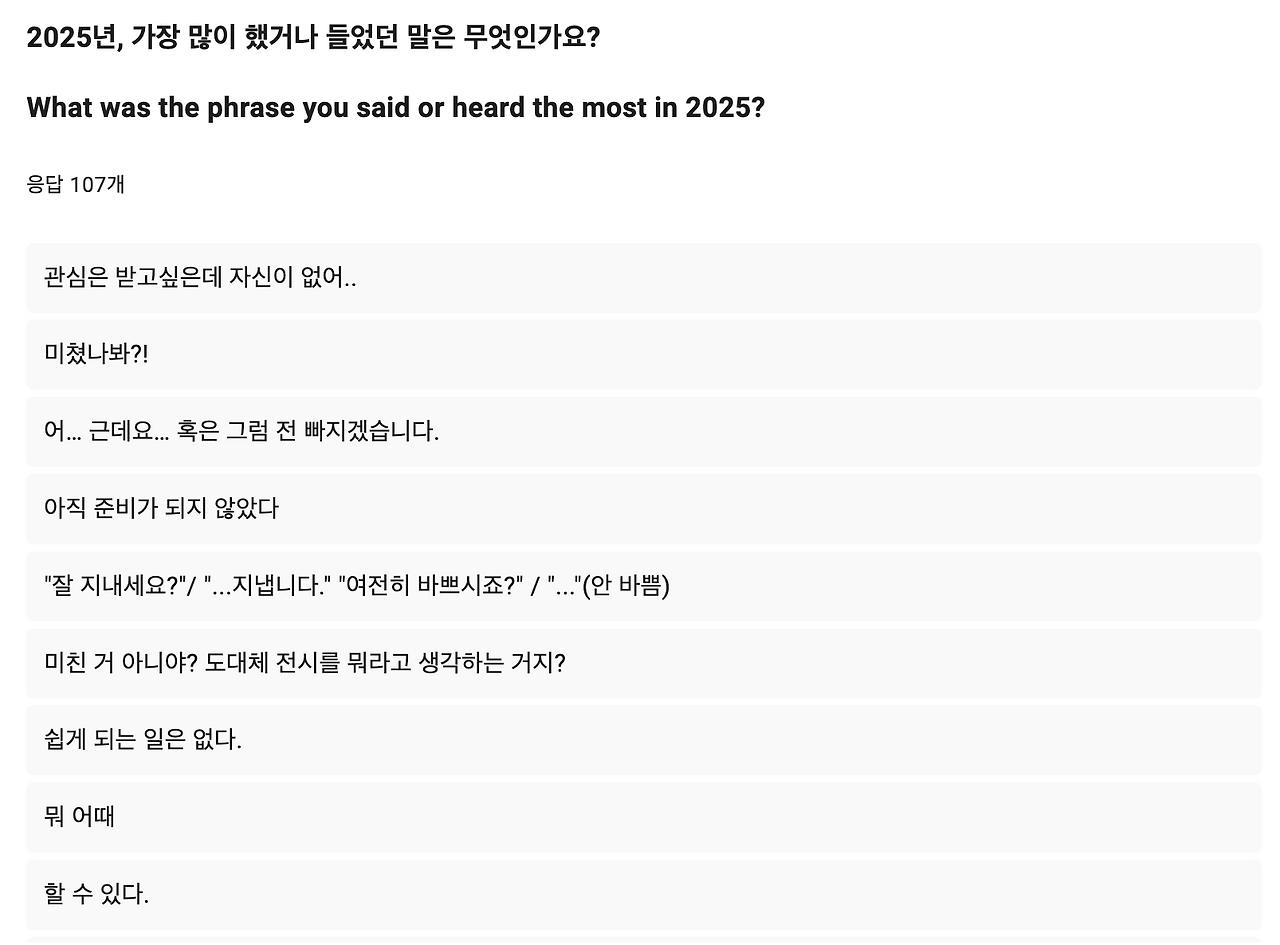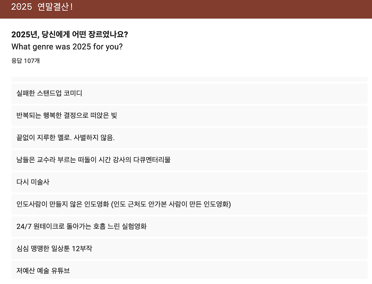 답변은 12X12 연말 모임 1부 토크 2025 날 위한 문화예술 앙케트 결과 공유를 위해 사용됩니다.