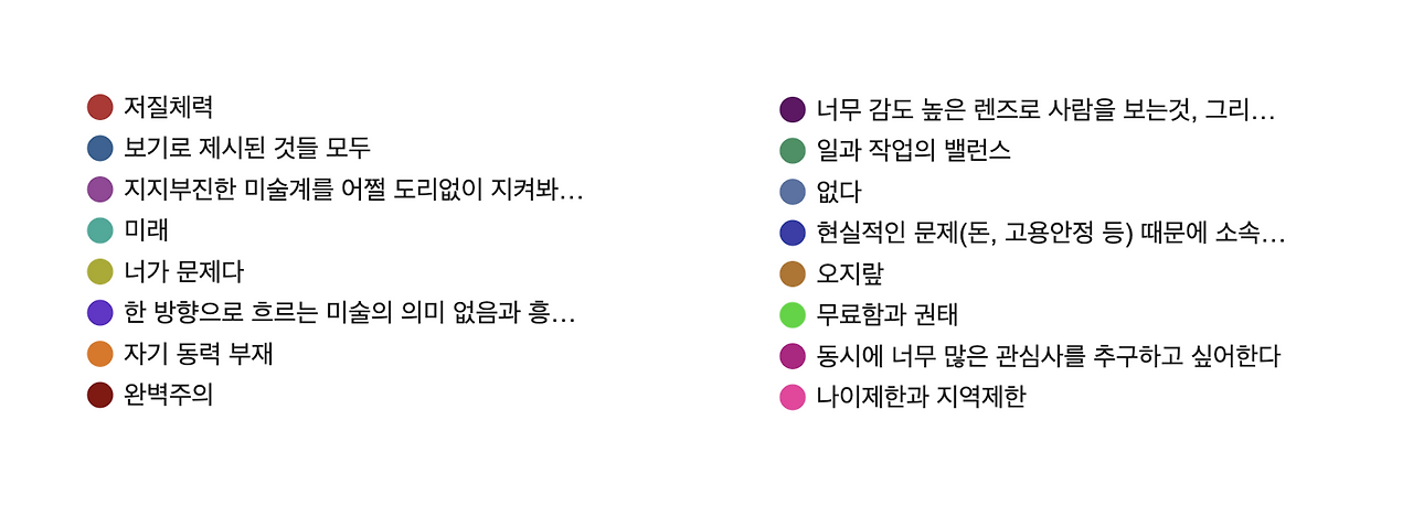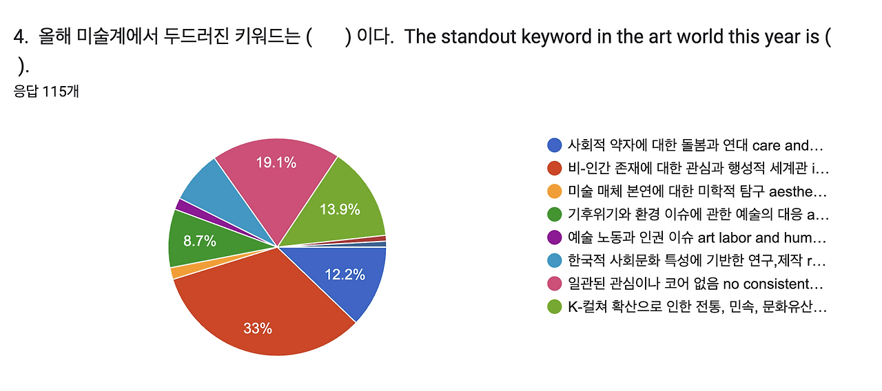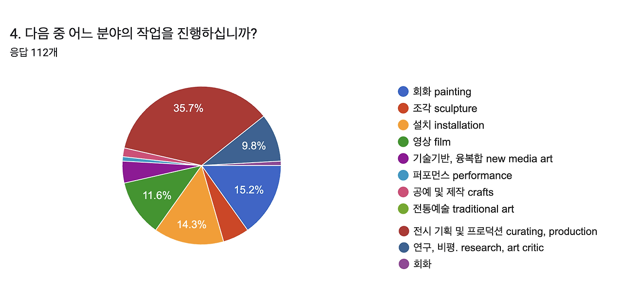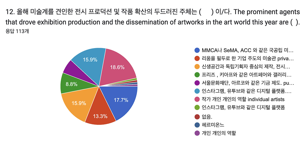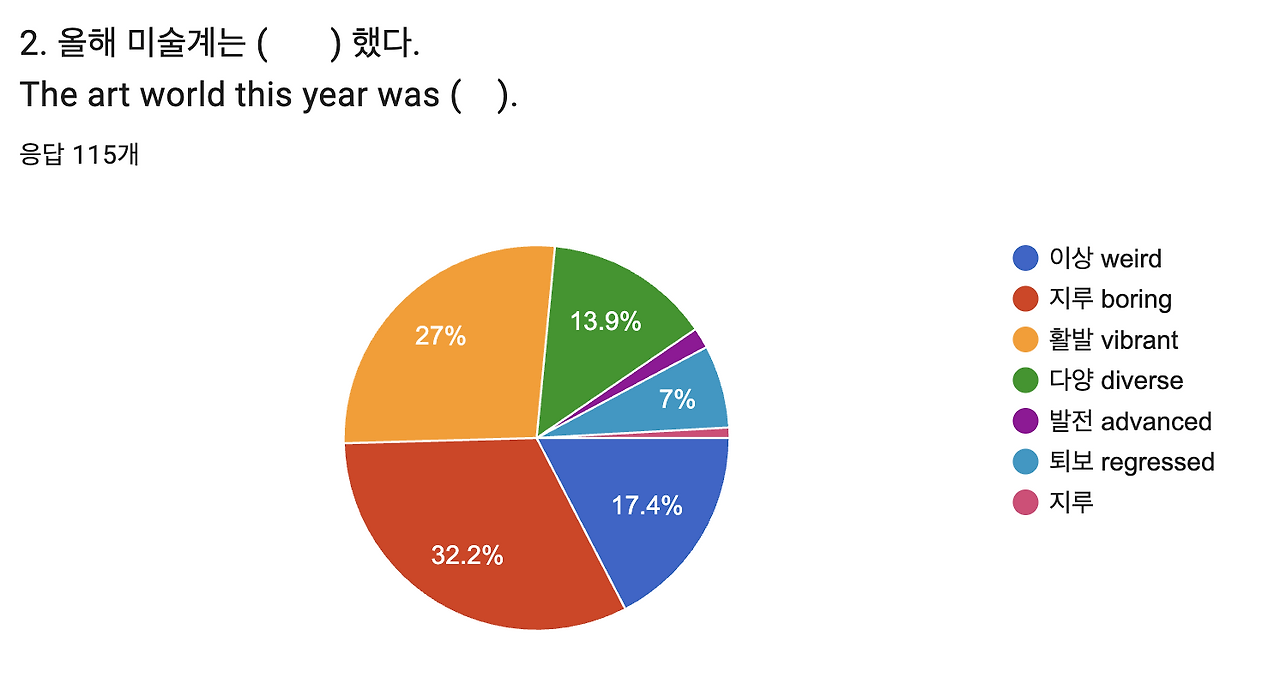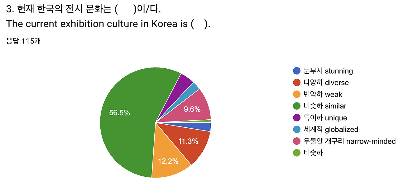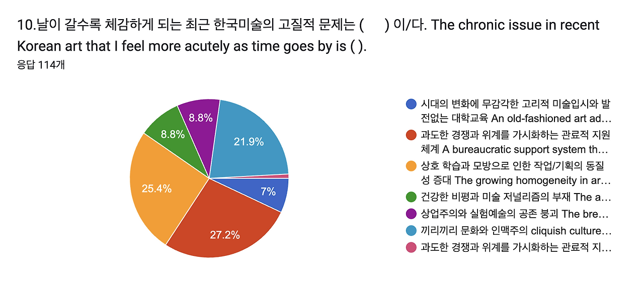 대체적으로 응답자들은 한국 문화예술 생태계에서의 다양성과 독창성 부족, 경쟁과 생계 문제, 관행적인 시스템의 경직성 등에 깊은 관심과 문제 의식을 표했습니다. 근래에 볼 만한 전시가 별로 없고, 전시 기획에 관한 집단의 기대감이 별로 느껴지지 않았습니다. 스스로에 대한 고평가와 외부의 저평가 사이의 간극 또한 확인할 수 있었습니다.