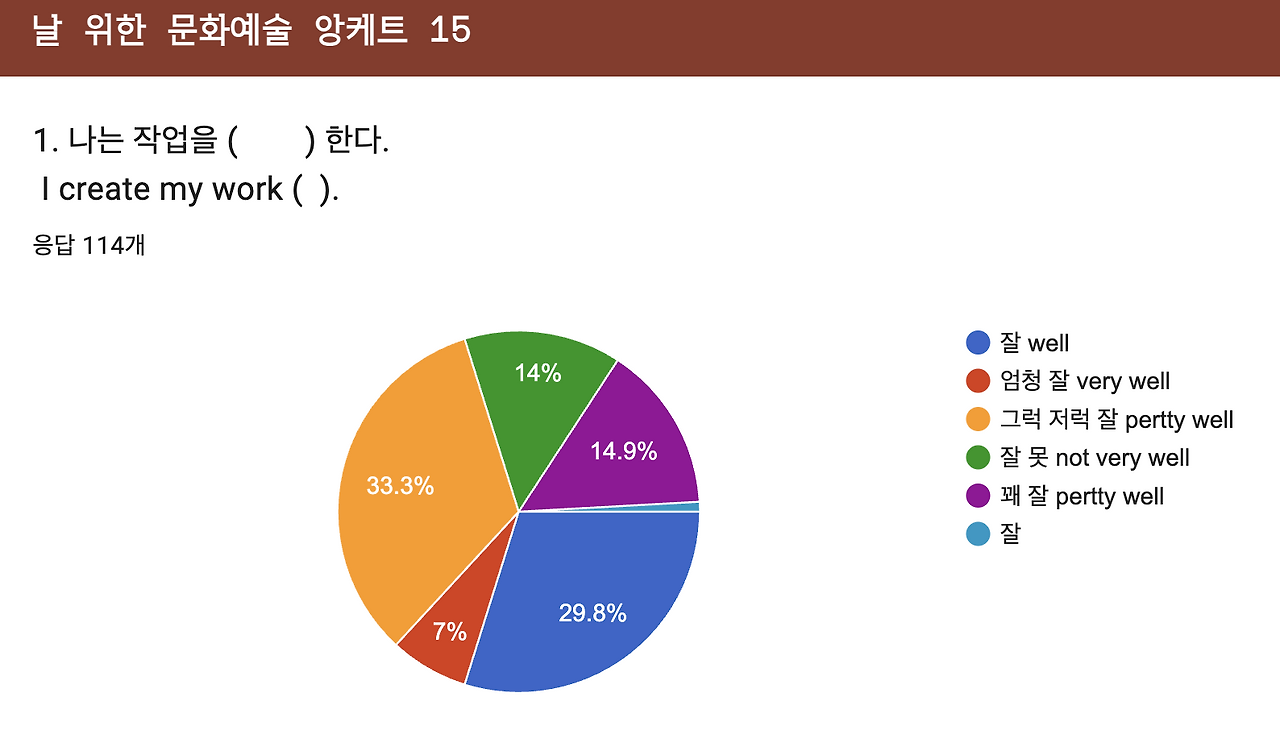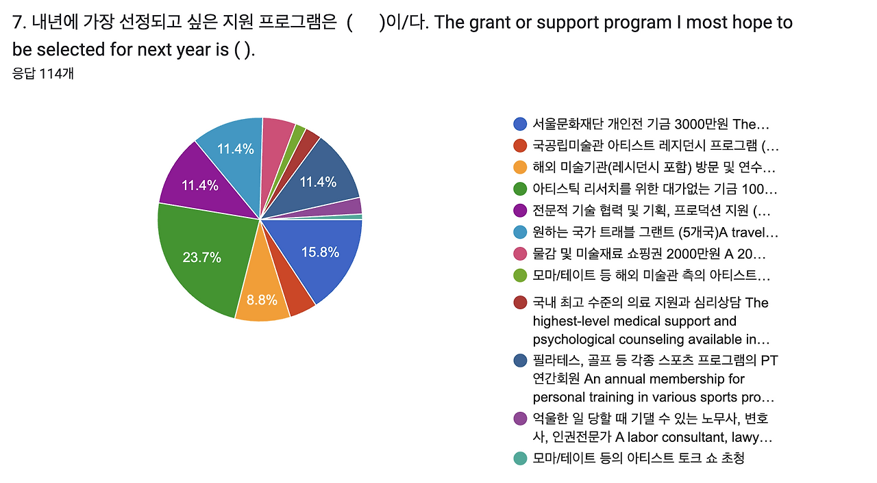 더불어 객관식 문항에 담기 어려운 개인의 독자적 인식과 개성적 의견을 수합하기 위해 설문 마지막 파트에는 주관식 문항을 구성하였습니다. 일종의 열린 질문이라고 할 수 있겠지요. 각각 100개 이상의 서로 다른 주관식 답변이 본 앙케트의 하이라이트라고 할 수 있고, 예술가다운 시니컬한 유머와 귀여운 엄살, 그 안에 담긴 양가감정, 즉 매 순간 갱신되고 서로 뒤바뀌는 희망과 절망의 코드로부터 무척이나 공감하는 바가 컸습니다. 미러링 그 자체!