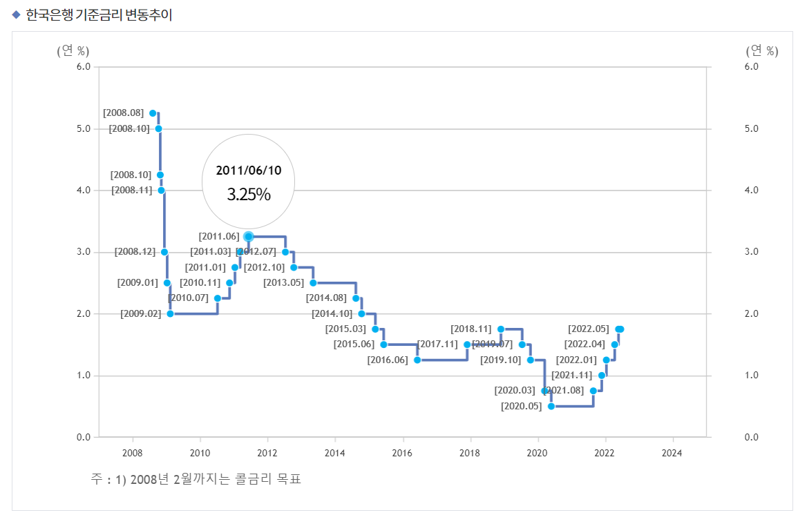 2008년 글로벌 금융위기 이후 우리나라 기준금리가 가장 높았던 시기는 이명박 정부 때인 2011년 6월 10일부터 2012년 7월 11일까지 약 1년 1개월로 당시 기준금리는 3.25%였다.