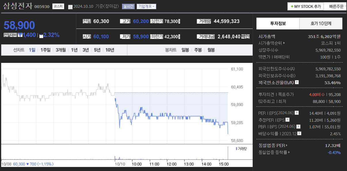삼성전자가 10월 10일 종가 기준 5만 8900원을 기록하며 우려했던 '5만 전자'로 내려앉았다.