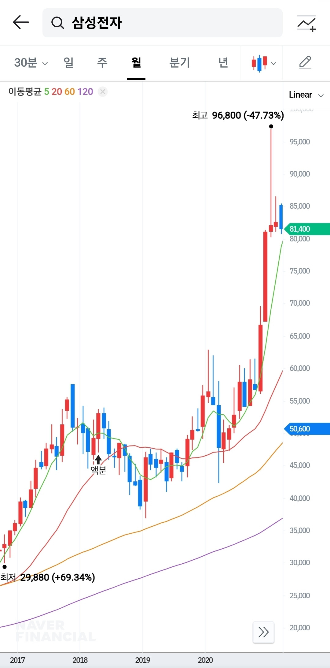 코스피 대장주인 삼성전자 주가도 2017~2018년 메모리 슈퍼사이클 당시 사상 최고치를 경신하며 상승세를 이어갔고, 2018년엔 액면 분할도 실시하며 장밋빛 전망이 지배적이었다.