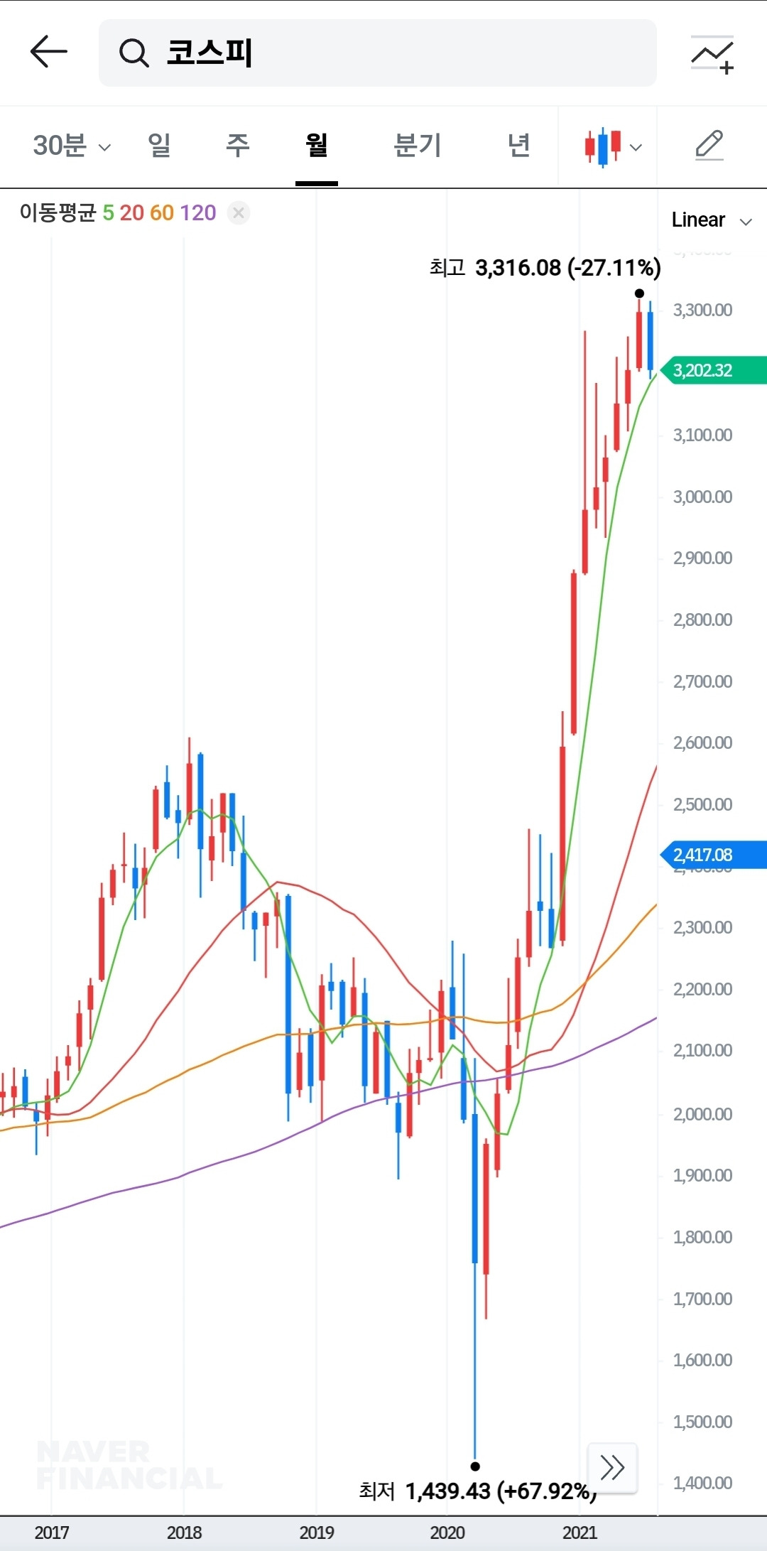 트럼프 1기 집권기간인 2017년 1월~2021년 1월, 코스피지수 월봉 차트다.