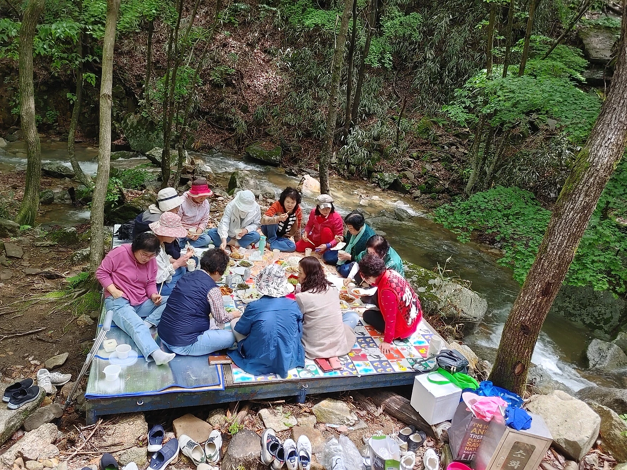 초록물이 쏟아질 듯 푸르른 나무 터널을 지나 평상 위치에 도착했다. 전날 워낙 많은 비가 내린 탓에 계곡은 흘러가는 물소리가 웅장하다. 물가 최적의 장소에 위치한 평상에 준비해 온 돗자리를 깔았다. 전원이 도착하여 준비해 온 음식을 풀었다. 5월 모임을 야유회로 하자는 의견과 함께 도시락을 싸겠다던 후배가 푸짐한 메뉴를 풀어놓는다. 마라톤도 하고 희곡도 쓰면서 늘 바쁘게 사는 후배는 음식솜씨도 뛰어나다. 여러 종류 나물부터 불고기, 육전, 전, 김치까지 가짓수가 열 손가락을 다 꽂아야 할 정도이다. 거기에다 샐러드를 몇 가지 만들어온 회원, 찰밥을 따끈하게 지어온 회원, 전날 땄다는 두릅을 데쳐온 회원이 있어 잔칫집 상만큼 푸짐하다. 과일을 협찬하겠다는 선배는 커다란 수박, 망고, 가지포도, 참외까지 세심하게 준비해 왔다.