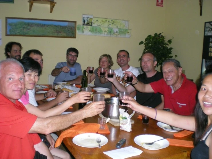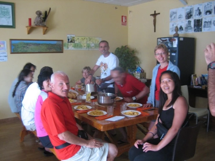 "밥 먹어." 15분 정도 흐른 후 저녁식사가 다 되었다며 장까를로가 사람들을 불렀다. 거실 중앙에 놓인 커다란 식탁에 스페인, 이탈리아, 프랑스, 브라질 등 다양한 국적의 순례자분들과 옹기종기 둘 러앉았다. 커다란 냄비 2개에는 '까르보나라파스타'가 가득 들어있었고 파스타와 함께 토마토 샐러드, 레드와인이 우리의 저녁을 풍요롭게 해 주었다. 오늘의 식사기도는 스윗한 호세 아저씨가 맡았다.