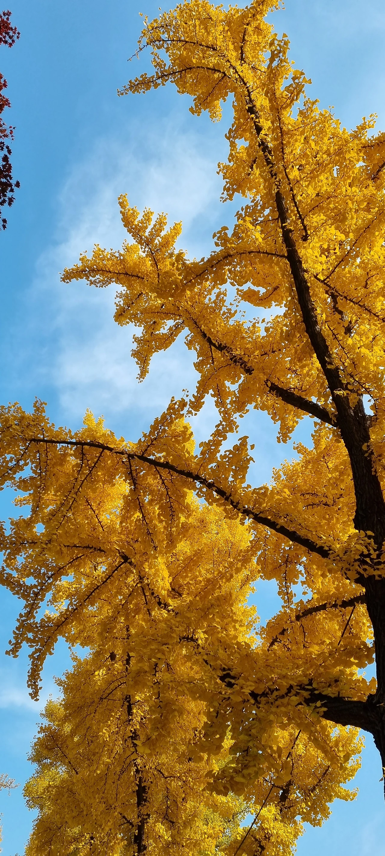 가을 하늘을 배경으로 황금처럼 매달린 은행잎들이 보인다.
