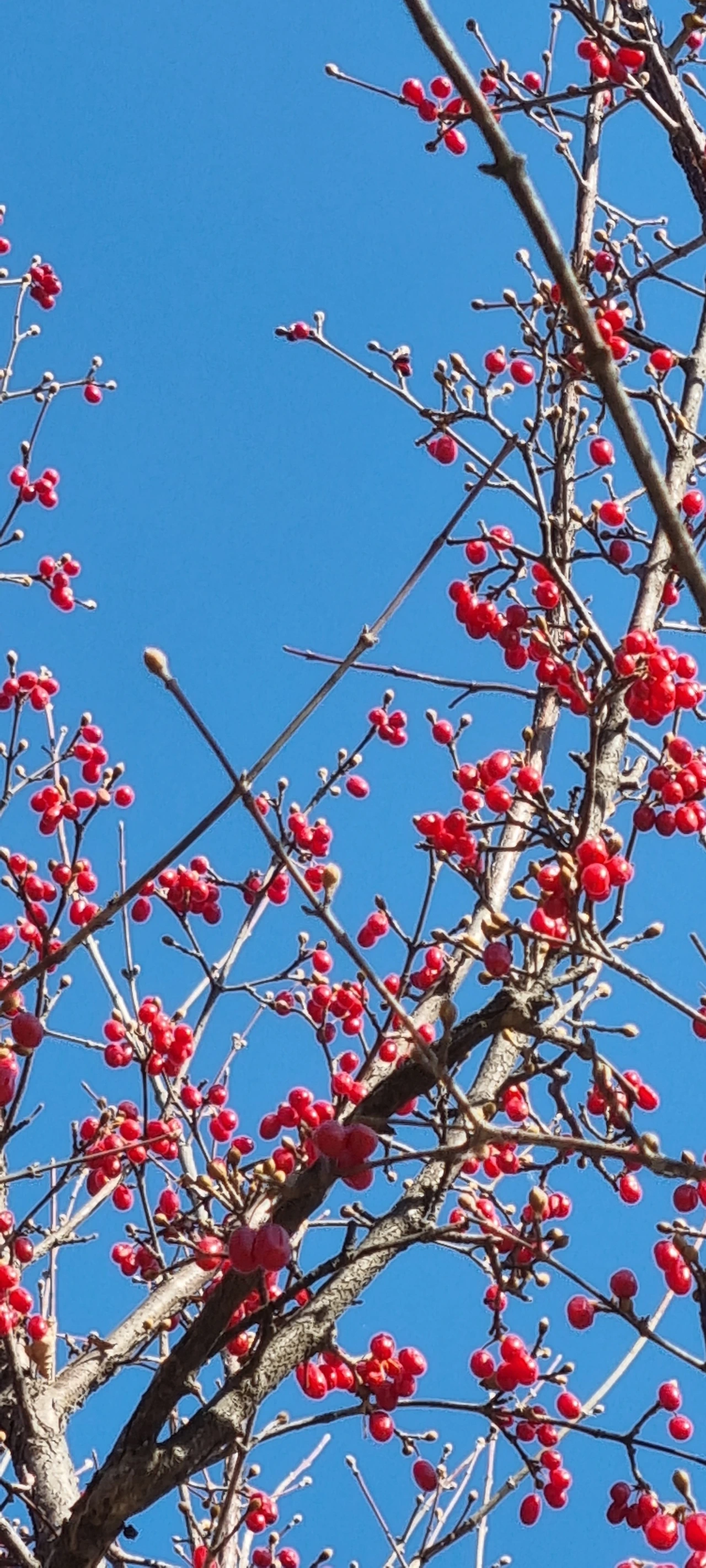 붉은 산수유 열매가 주렁주렁 달린 나무가 눈에 띄어