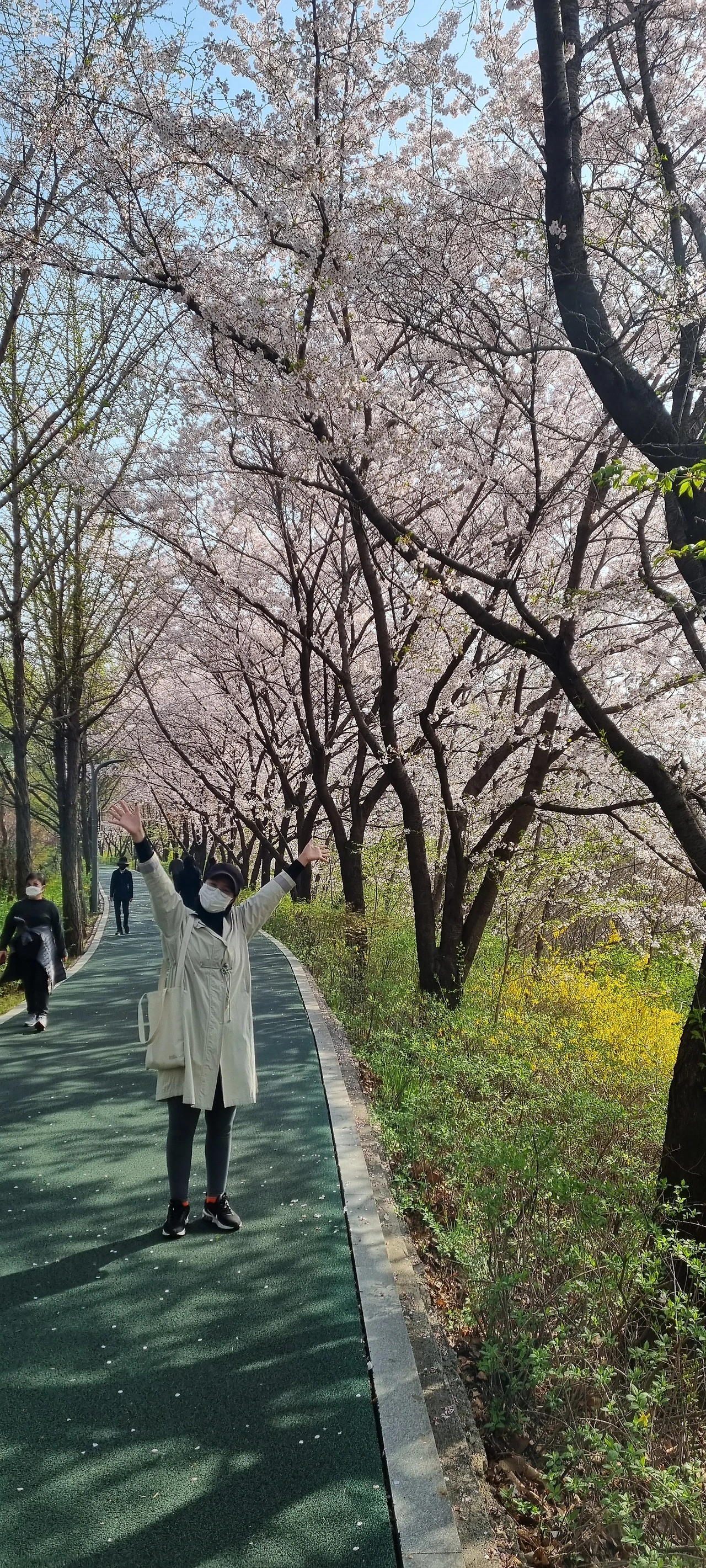 신나서 펄쩍 뛰는 짱이를 데리고 차로 20분 거리인 양재 시민의 숲 주차장에 내리니, 이른 아침인데도 부지런한 상춘객들이 벌써 나와 절정인 벚꽃을 연신 사진에 담고 있다.