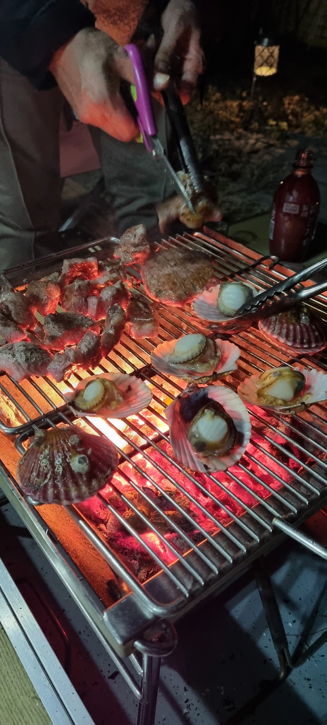 솔방울 한 보따리를 차에서 꺼내와 신나게 불을 피운다.