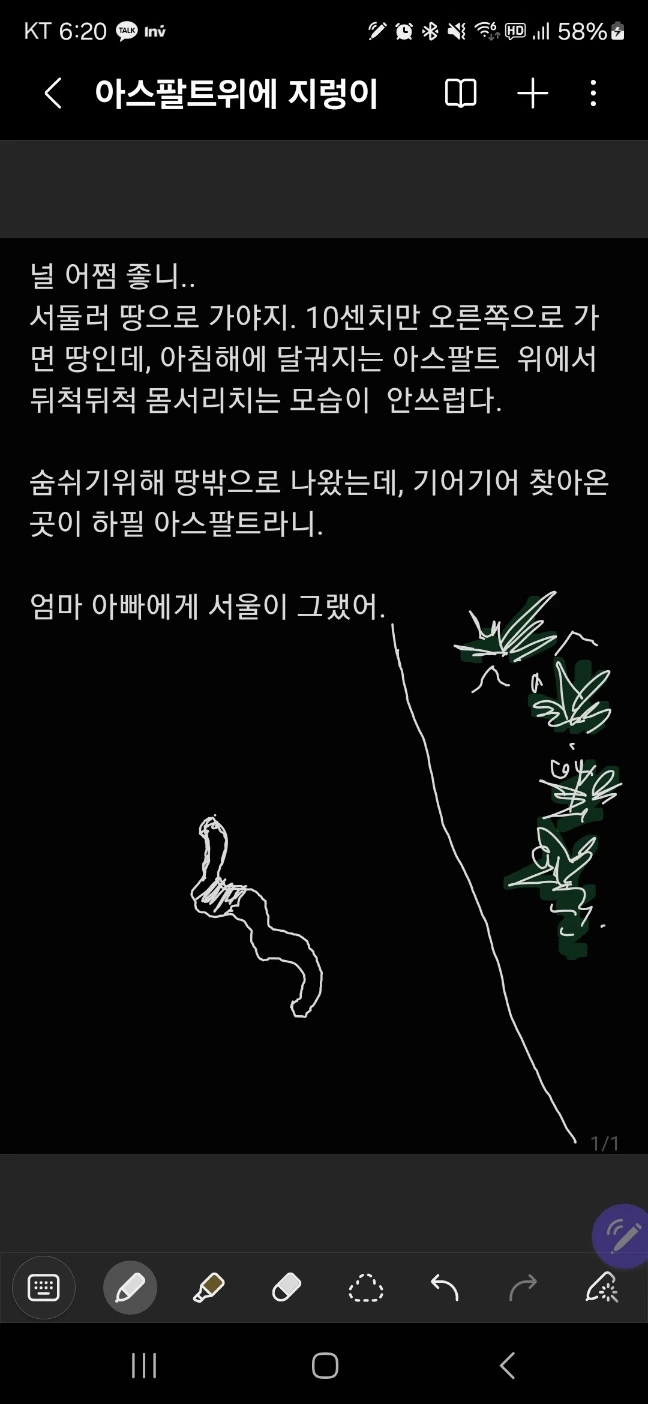 아스팔트 위에서 꿈틀대는 지렁이를 보고돈 벌러 고향 떠나 팍팍한 서울살이에 고생하시던돌아가신 부모님 모습이 떠올라 써봤어.