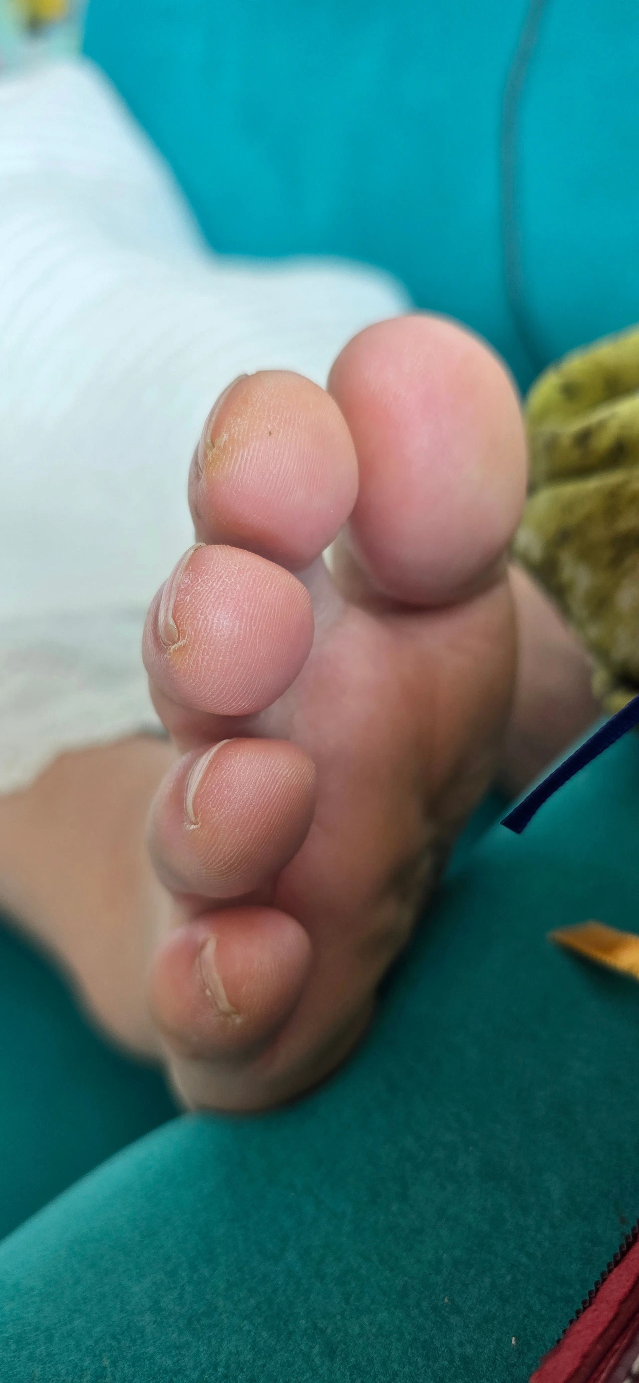 침대 위 이불 밖으로 빼꼼히 나온 통통한 발가락을