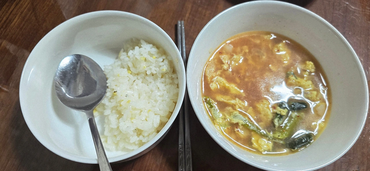 어머니의 작고 굽은 등을 보며 식탁에 앉았는데