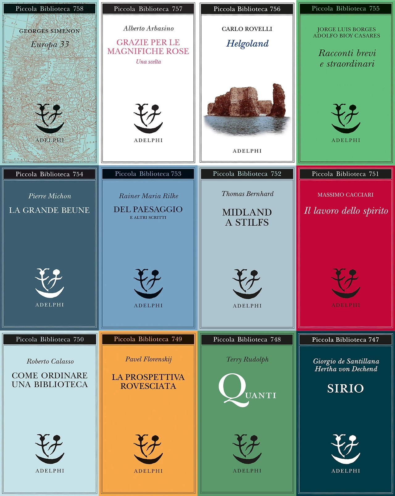Adelphi의 책. 동일한 형태의 단순한 디자인이지만 책의 표지 색상을 다르게 하는 게 특징이다.