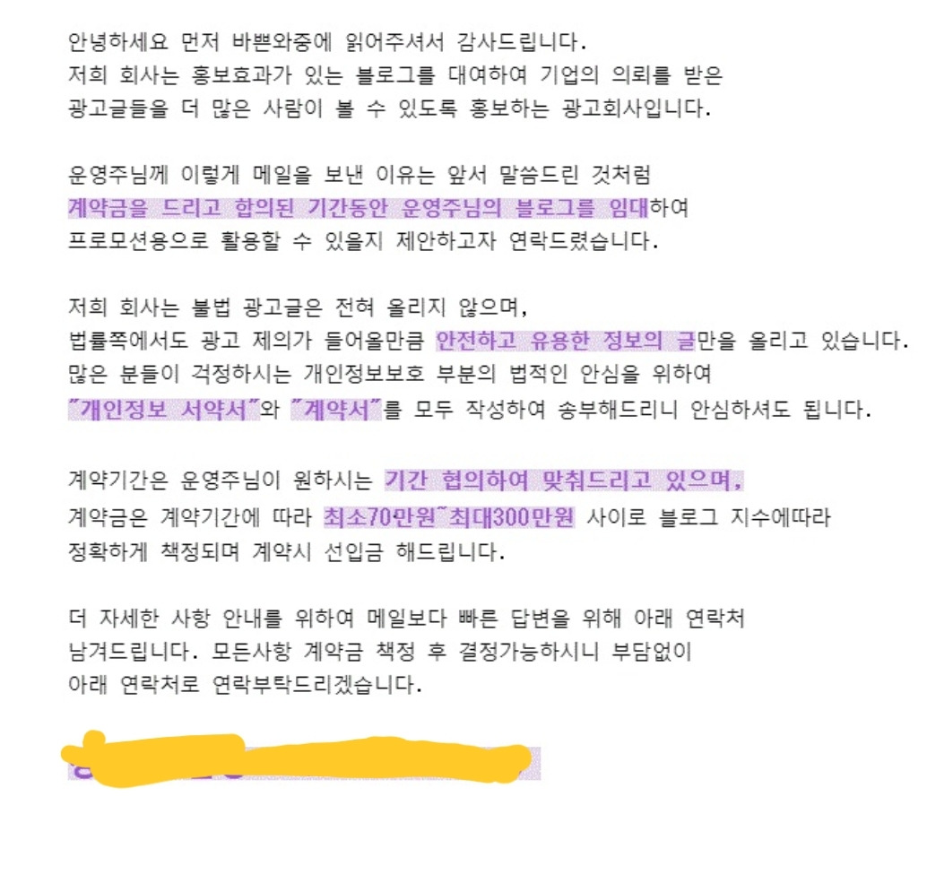 블로그 마케팅에 대해서 들어본 적은 있어도 아는 바는 없다. 블로그로 홍보를 하려는 생각이 없었으니 관심도 없었다. 내게 이메일을 보낸 업체들은 대부분 '선입금' '100만 원-350만 원 사이' '법적문제 없음' '계약서 송부'라는 문구와 함께 자신들이 직접 운영하고 싶으며 함께 일할 생각이 있으면 카톡이나 전화를 달라고 했다. 신종사기인가 싶었는데 블로그 운영자들에게 수시로 오는 이메일이라고 했다. 이렇게 블로그를 임대해달라는 내용의 이메일 때문에 아예 블로그를 닫고 브런치에서 글을 쓰기 시작했다는 사람도 있었다.