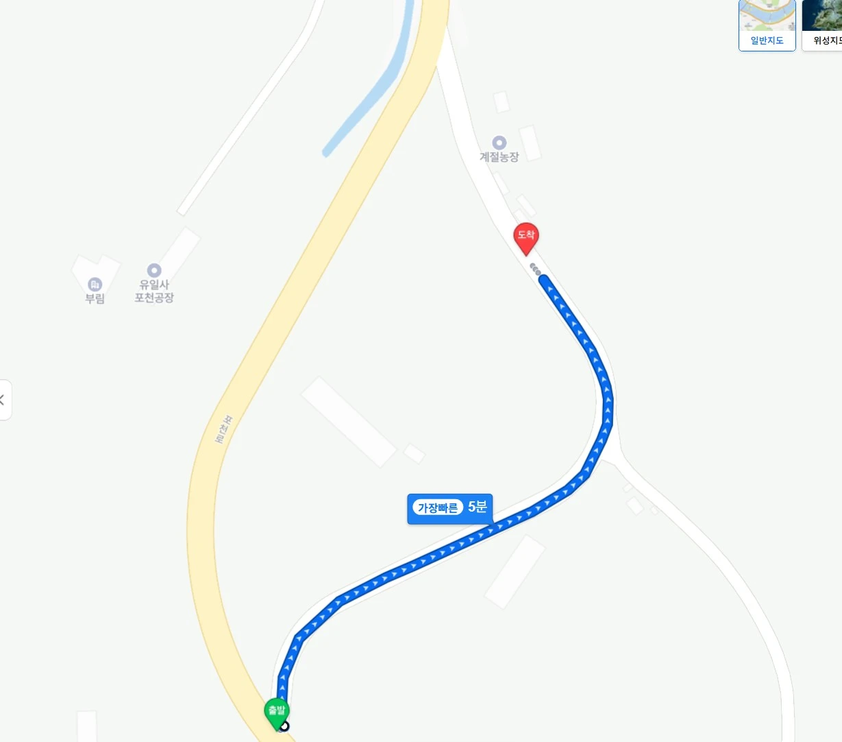 이동 중에 지도 앱이 안내해 준 길 대신, 지도상에 표시된 다른 산길(도로가 아닌 도보 길)로 우회해 보았습니다. 지도는 노란색 길로 인도했지만, 산길로 가 보고 싶은 마음에 하얀색 길만 보고 산을 올랐습니다. 하지만 지도와 달리 실제로는 중간에 길이 끊겨 있었습니다. 지도를 무조건 신뢰해서는 안 되겠다는 교훈을 얻었습니다. 이 글을 쓰기 위해 다시 한번 지도로 확인해 보니, 그림상으로는 길로 되어 있지만 '길안내'로는 저곳을 통과할 수 없습니다.
