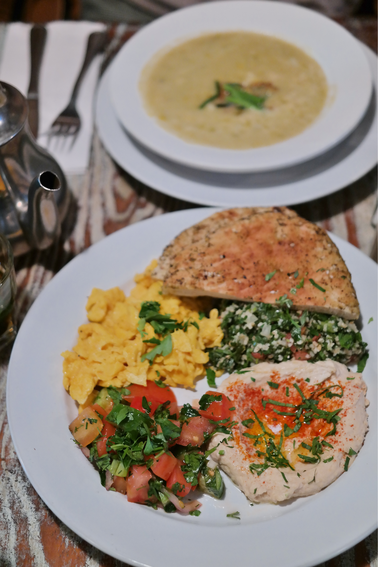 세 번째로 방문한 날에는 가지를 활용한 디핑소스인 바바가누쉬, 병아리콩을 알맞게 튀긴 음식인 팔라펠도 주문했다. 새롭게 양고기 요리도 시켜봤는데 오븐에 구운 장조림 스타일의 양고기였다. 수프도 참 맛있었다.