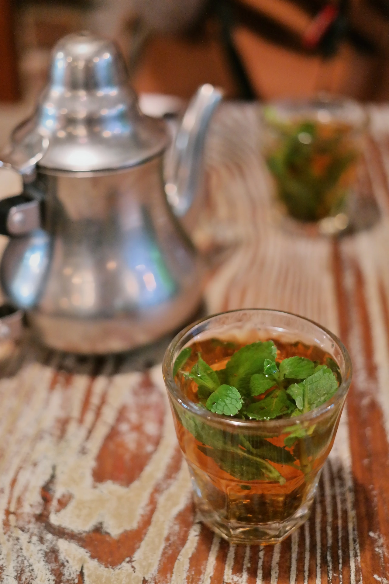 음식을 즐긴 후 마무리로 민트 찻잎이 잔뜩 들어간 따뜻한 차를 마셨다.