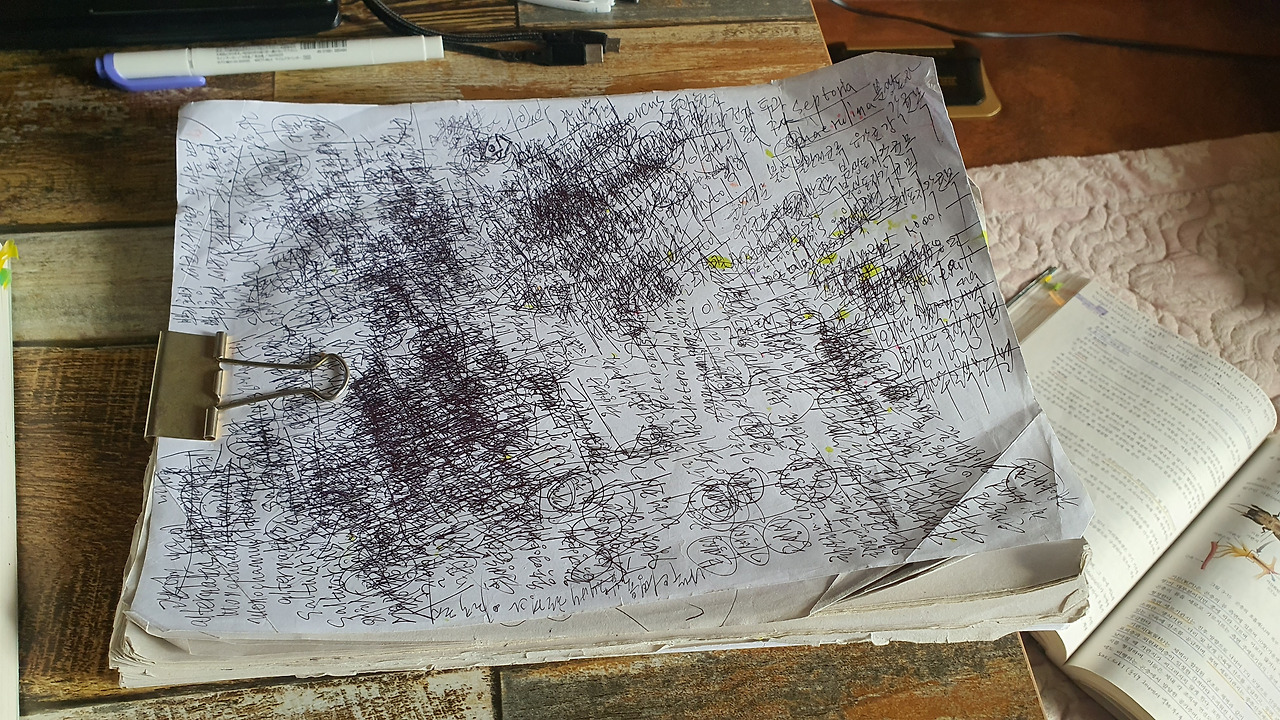 책상 위에 놓인 미색지 연습장. 아버지는 당장 일이 없어 자격증 취득을 준비하신다고 들었다. 빼곡히 적힌 작은 글씨들이 마치 흐릿한 잉크로 그려진 풍경화 같았다. 반복적으로 쓰인 필체와 무질서한 배열 속에서 의문이 스쳤다. 효율적인 방법이 넘치는 시대에, 이런 고전적인 방식이 과연 통할까.