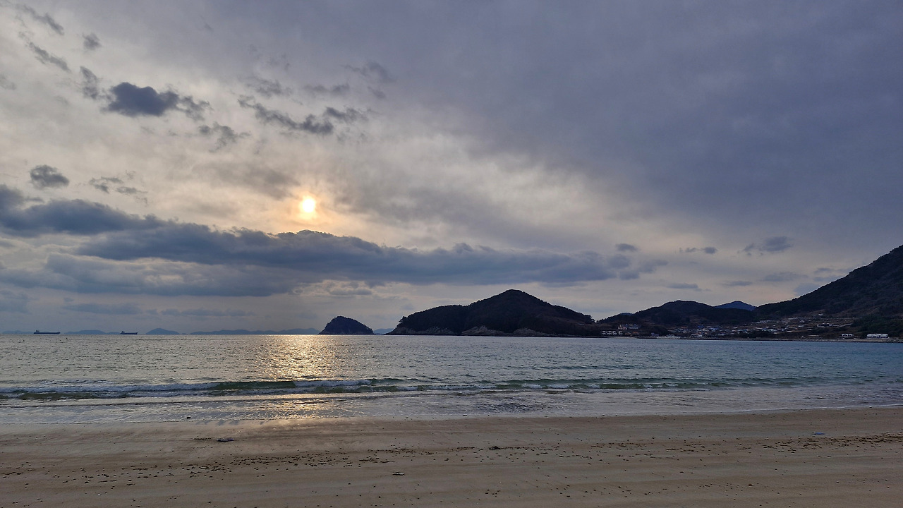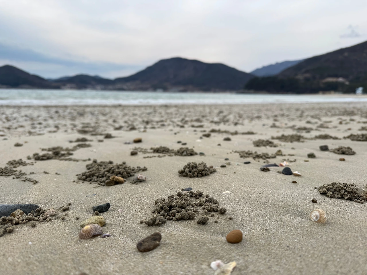 바람이 차가운 해변에 게들이 토해낸 몸 크기만 한 모래 알갱이들이 장관을 이루고 있다.