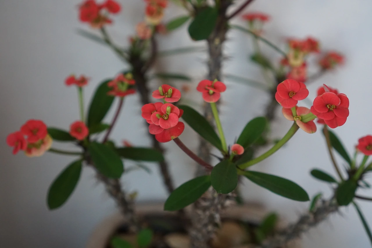 거실 한편, 꽃기린이 붉은 꽃을 피웠다. 햇빛을 덜 받으면 꽃잎이 하얗게 변한다고 했다. 붉게 물든 꽃과 하얀 꽃잎이 조화롭게 피어 있었다. 모습을 달리해도 여전히 아름다웠다.
