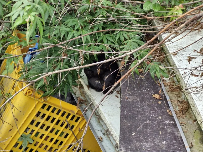 텃밭 옆 허름한 마대 더미 위에