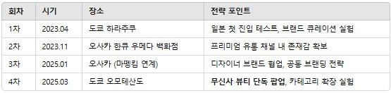 총 4회에 걸친 일본 팝업스토어 운영. 그것도 하라주쿠, 오모테산도, 오사카 한큐백화점 등 핵심 상권만 공략했다.