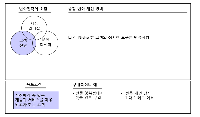 이에 최적화된 제품과 서비스를 제공하는 데 조직의 역량과 자원을 집중함으로써 지속적인 고객 만족과 충성도를 달성하는 데 목적이 있습니다.