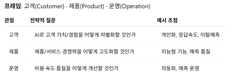 기업이 AI를 통해 지속적인 경쟁우위를 확보하기 위해 집중해야 할 변화의 방향을 다음 세 가지 전략적 초점 중에서 규정합니다.