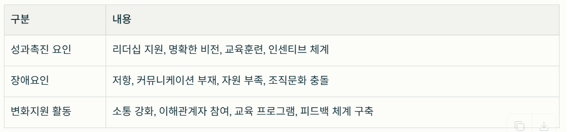 변화지원 활동은 무지원 대비 성과 향상분으로 측정되며, 주요 포인트는 성과 감소폭 축소, 하락 기간 단축, 상승 촉진 입니다. 이는 장애요인 극복(저항·자원 부족)과 촉진요인 관리(소통·교육)를 통해 단기 하락을 최소화 합니다. 이때 피드백 체계와 변화 준비 진단이 핵심 역할을 합니다.