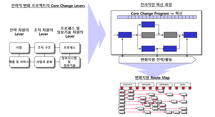 전사의 성과는 단일 영역의 개선이 아닌, (1)전략·(2)조직·(3)프로세스 및 정보기술 전반에서의 유기적인 변화를 통해 혁신적으로 향상될 수 있습니다.