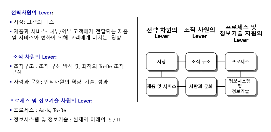 이러한 변화의 6가지 Lever는 긴밀히 연계되어 있으므로, 하나의 Lever를 움직이게 되면 결국엔 다른 Lever에도 영향을 끼치게 됩니다. 따라서, 6가지 Lever를 종합적으로 고려하되 변화관리의 주요 Lever를 무엇으로 결정할지 에 대한 면밀한 검토가 선행되어야 합니다.