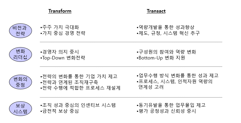 전사 성과 혁신을 위한 전략적 변화는 Transform과 Transact라는 두 가지 상이한 접근으로 구분할 수 있다. 각 접근은 지향하는 비전과 전략, 변화 리더십, 변화의 중점, 그리고 성과 보상 방식에서 뚜렷한 차이를 보인다.