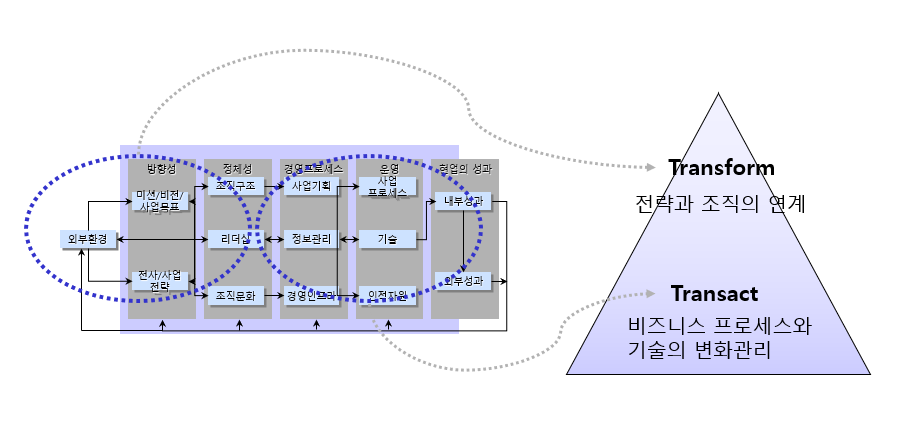 Transform이 조직의 방향성과 정체성, 즉 전략과 조직의 연계를 통해 근본적인 변화를 꾀하는 혁신이라면, Transact는 경영 프로세스, 운영 시스템, 기술, 데이타, 인적 자원 역량 등 실행 관점에서 구체적인 변화를 통해 성과를 창출하는 혁신으로 이해할 수 있겠습니다.