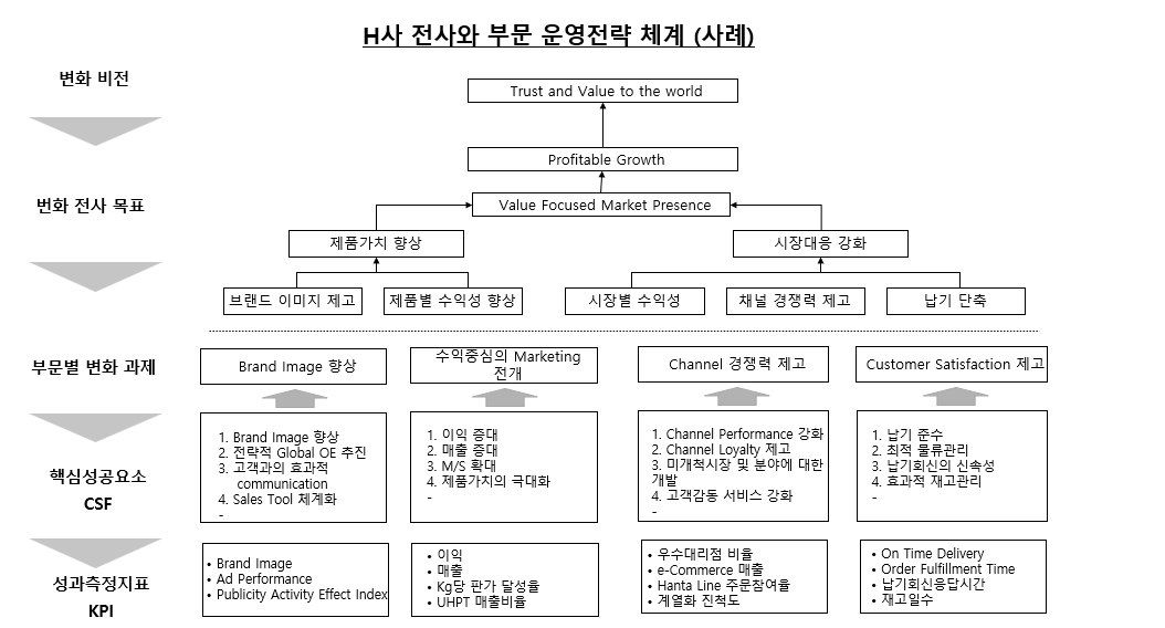 아래는 일반 제조기업(반도체, 예시)기준으로 전략체계 프레임워크를 적용해 보았습니다.