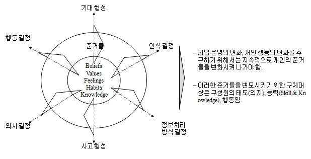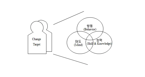 조직 구성원들의 준거틀(사고 방식)을 변화시키고, 프로젝트에의 원활한 적응을 도모하기 위해서는 대상 구성원(Change Target)들의 태도와 능력, 행동의 실질적인 변화가 이루어져야 합니다.