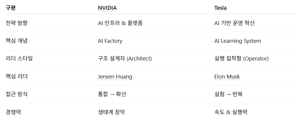 엔비디아와 테슬라는 모두 AI를 목표로 트랜스포메이션을 하고 있지만, 그 지향점과 리더십 스타일은 매우 다릅니다.