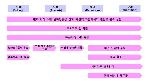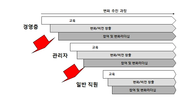 AX 변화리더십은 변화관리 프로그램 추진 단계에 맞추어 조직 계층상 아래로 내려오는 것이 바람직 합니다.