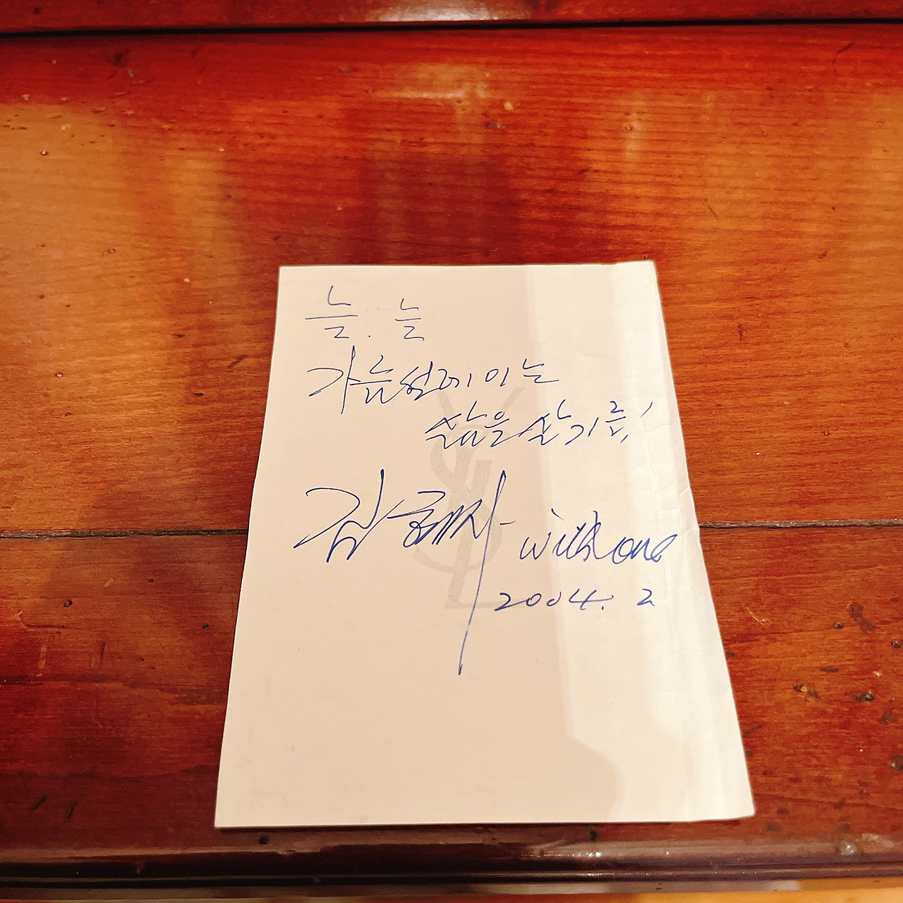 이렇게 회한에 젖었을 때, 손에 든 종이뭉치에서 아이 손바닥 크기만 한 메모장 한 장이 '툭!' 떨어졌다. 무엇인지 생각이 났다. 여배우 김혜자 씨의 사인이었다. 아주 오래전 김혜자 씨와 함께 찍은 사진 그리고 그녀가 써 준 글이었다. 그 글을 읽고 주저앉고 말았다. 참 이쁜 글인데 내 마음은 아팠다.