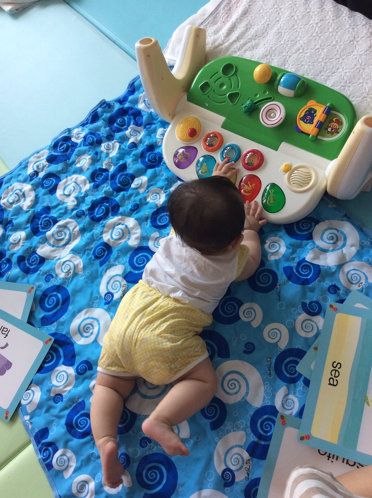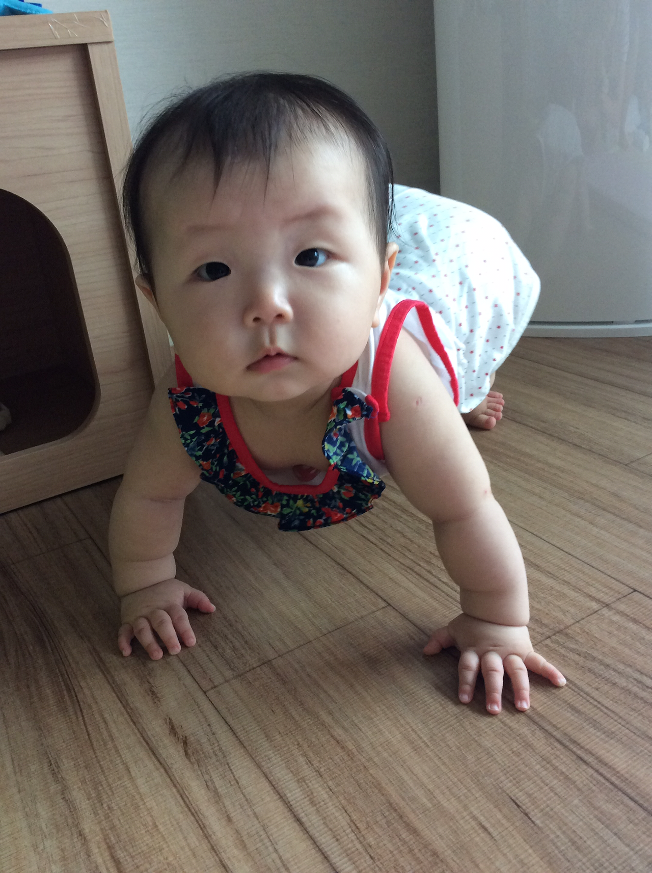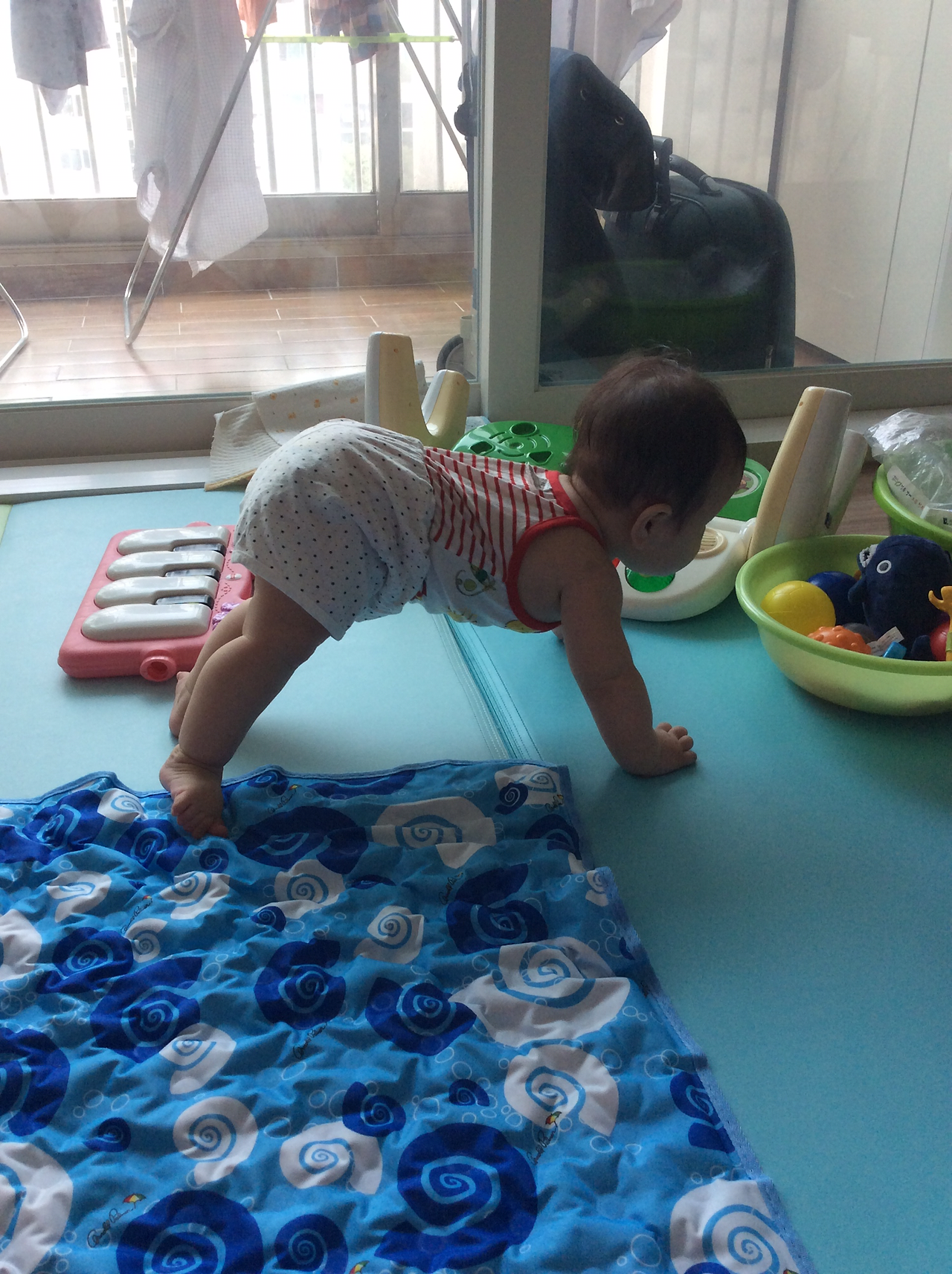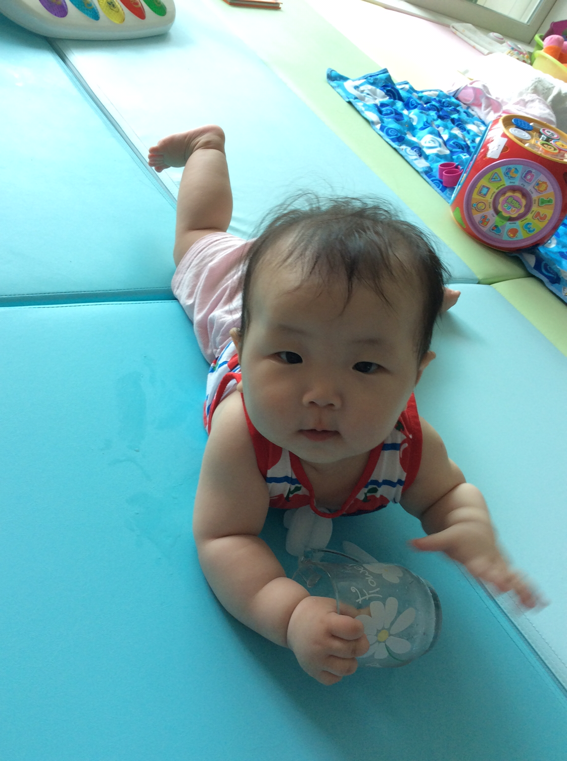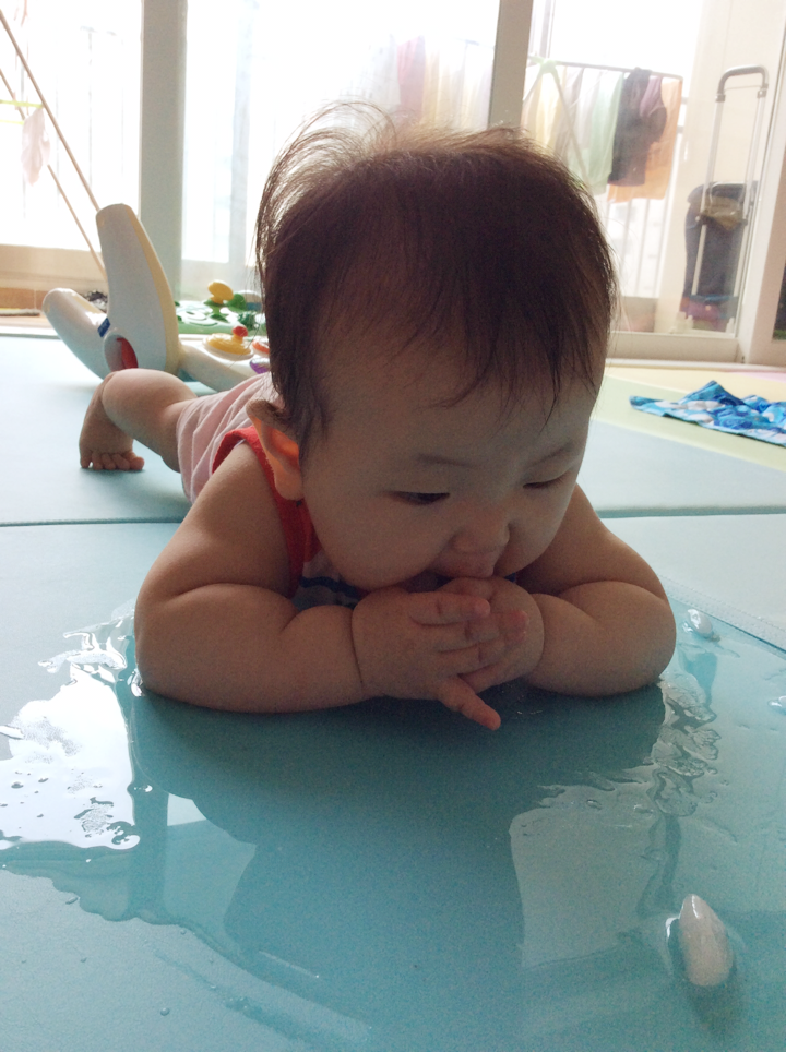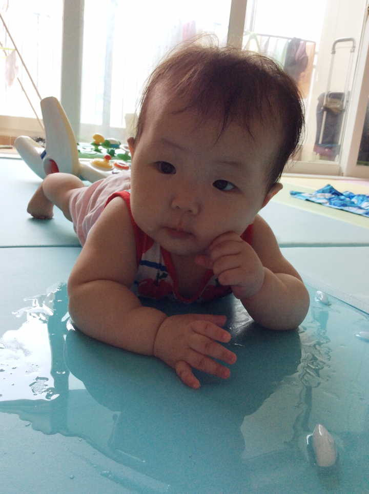 이미 기어다닐 준비는 다 된것 같은데, 손을 앞으로 내미는게 아직은 두려운지 엎드려서