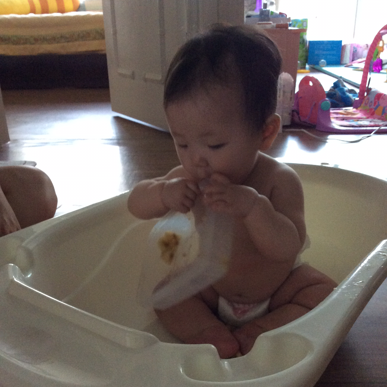 해주었는데 오늘은 남편도 있겠다 아주 욕조에다가 기저귀만 채워놓고 바나나 하나를