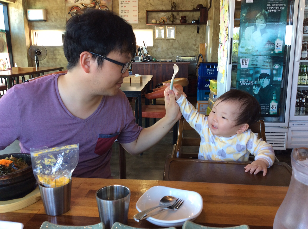 제주에서의 마지막 아침은 반딧불 한담. 다온이는 이유식.