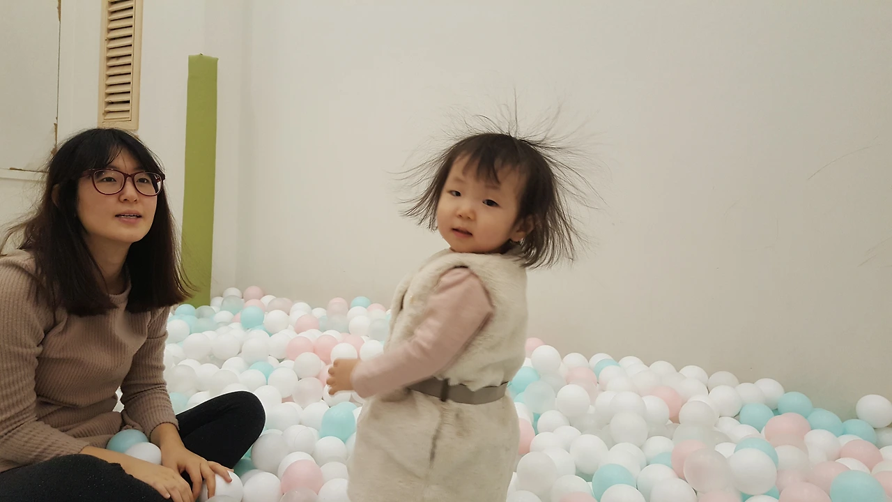 오랜만에 키즈카페에 간날, 방방을 타다가 나랑 부딪혀서 또다시 주저앉은 다온이.