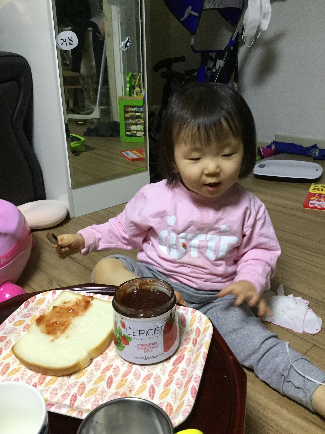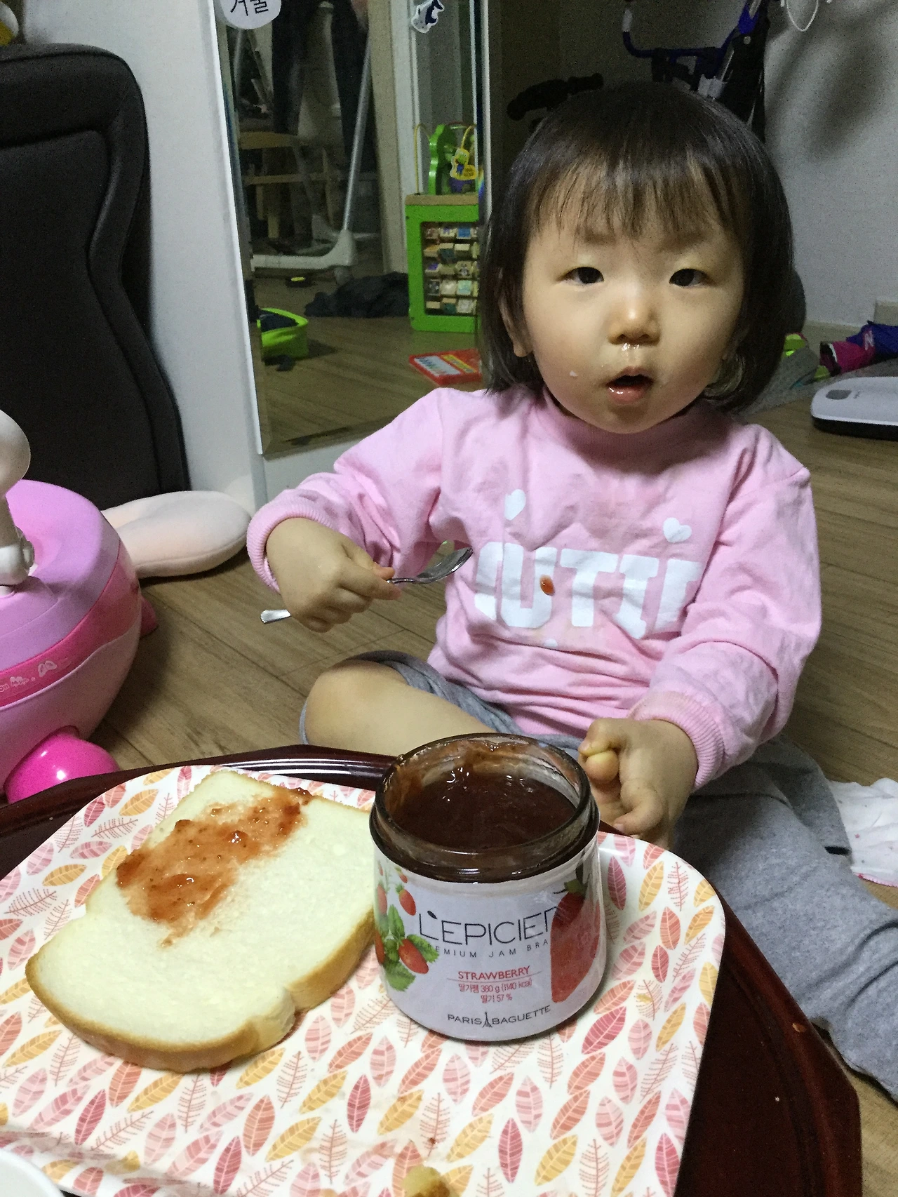 그래도 엄마마음을 아는지 늘 밝은 우리 다온이, 딸기쨈 발라먹으랬더니 좀 바르다가
